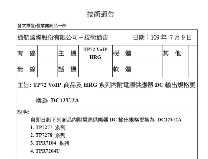 TP72 VoIP商品及HRG系列內附電源供應器DC輸出規格變更